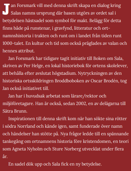 Sadeln och Valan söker belägg för att orten Salas namn härstammar från Valans attribut sadeln. Genom studier av båtgravsfynd, runstenar, Odens spår i trakten, litteratur samt ny forskning om vikingatiden visar Jan Forsmark att teorin har många belägg tillsammans med att andra av Valans attribut finns i andra ortnamn i trakten.